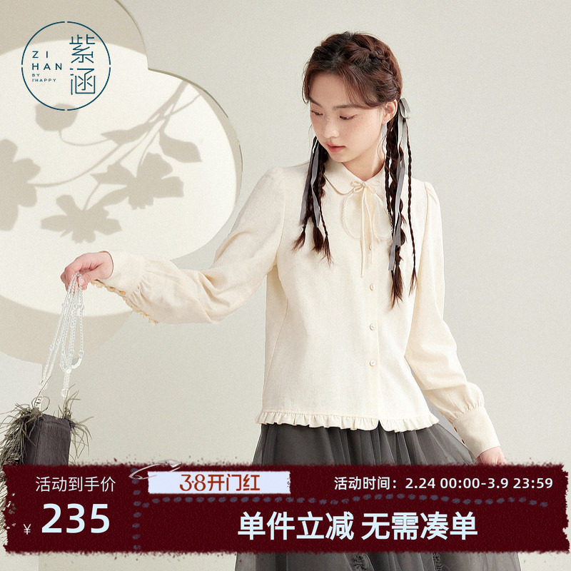 紫涵木耳边翻领灯笼袖衬衫女春秋季新款甜美盘扣领结暗纹休闲上衣