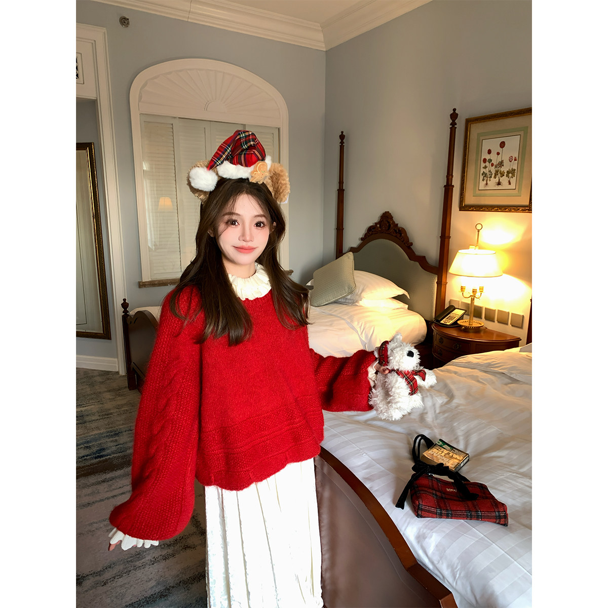 FF BLUE新年礼物 节日感红色灯笼袖羊毛毛衣经典宽松柔软圆领上衣