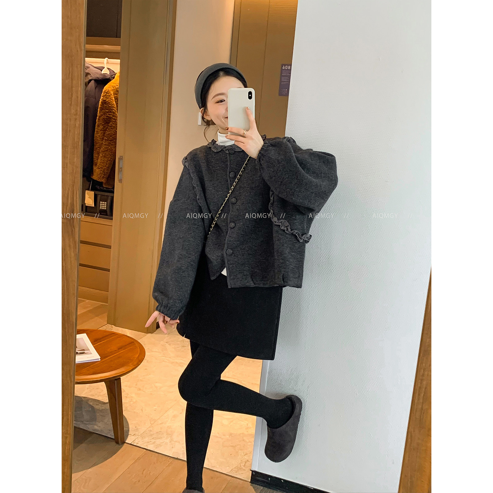爱情魔鬼鱼 设计感木耳边灯笼袖拼接针织开衫女2025冬季新款上衣