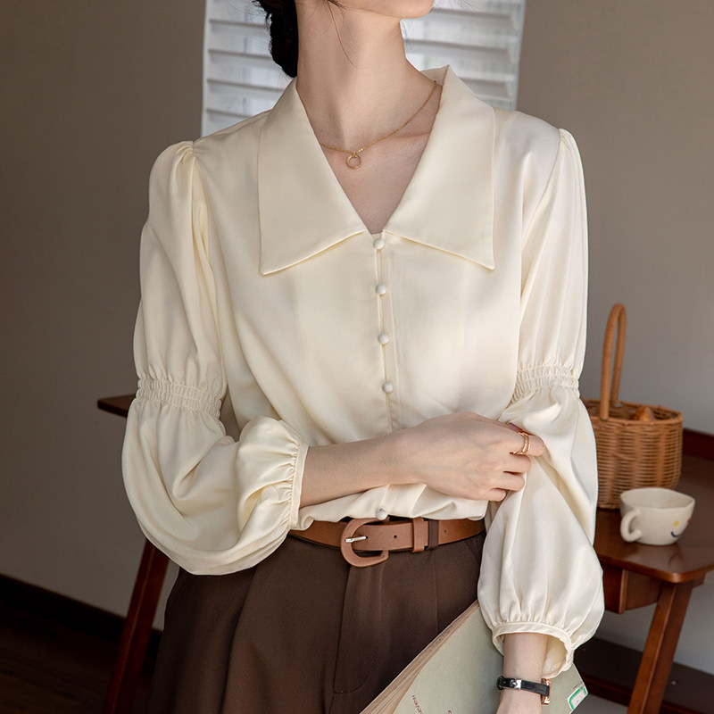 灯笼袖杏色衬衫女春秋季设计感小众法式复古衬衣职业通勤正装上衣