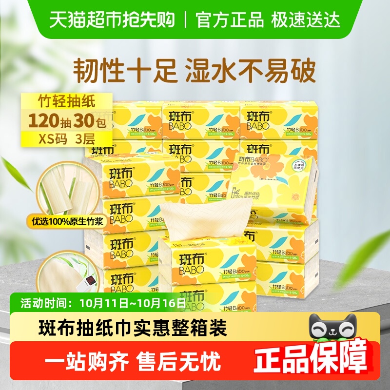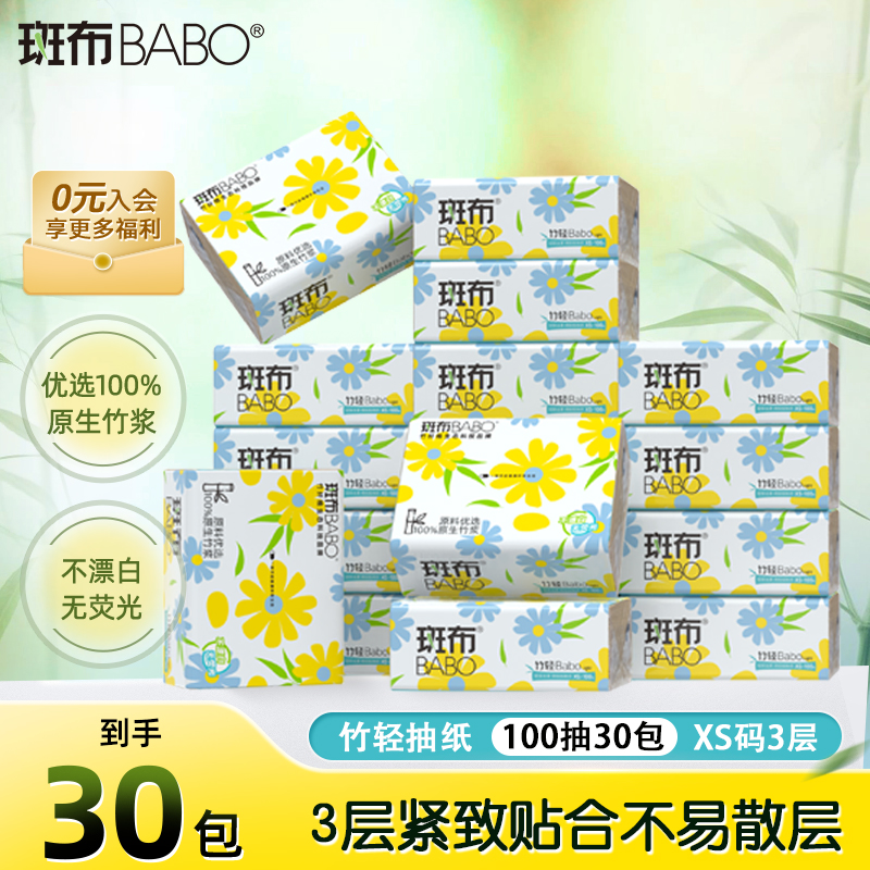 斑布本色原生竹浆抽纸100抽30包XS家用餐巾纸卫生纸实惠装面巾纸