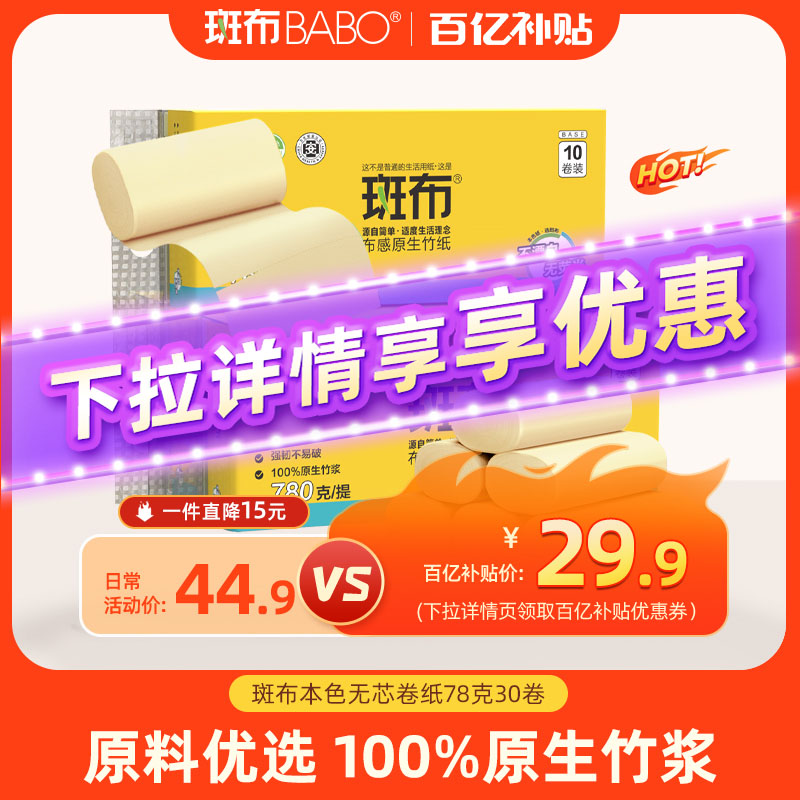 斑布本色无芯卷纸78克30卷4层加厚纸巾厕纸卫生纸家用实惠装