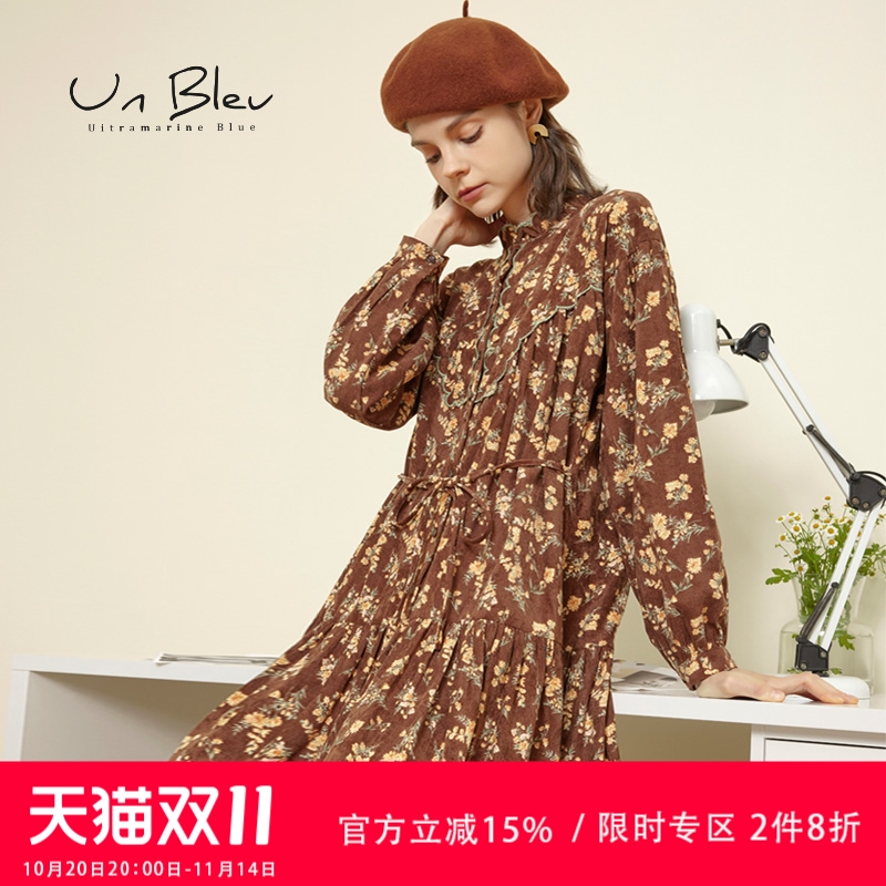 UnBleu长袖连衣裙春秋新款复古印花灯芯绒女装蓝色小众绝美裙子