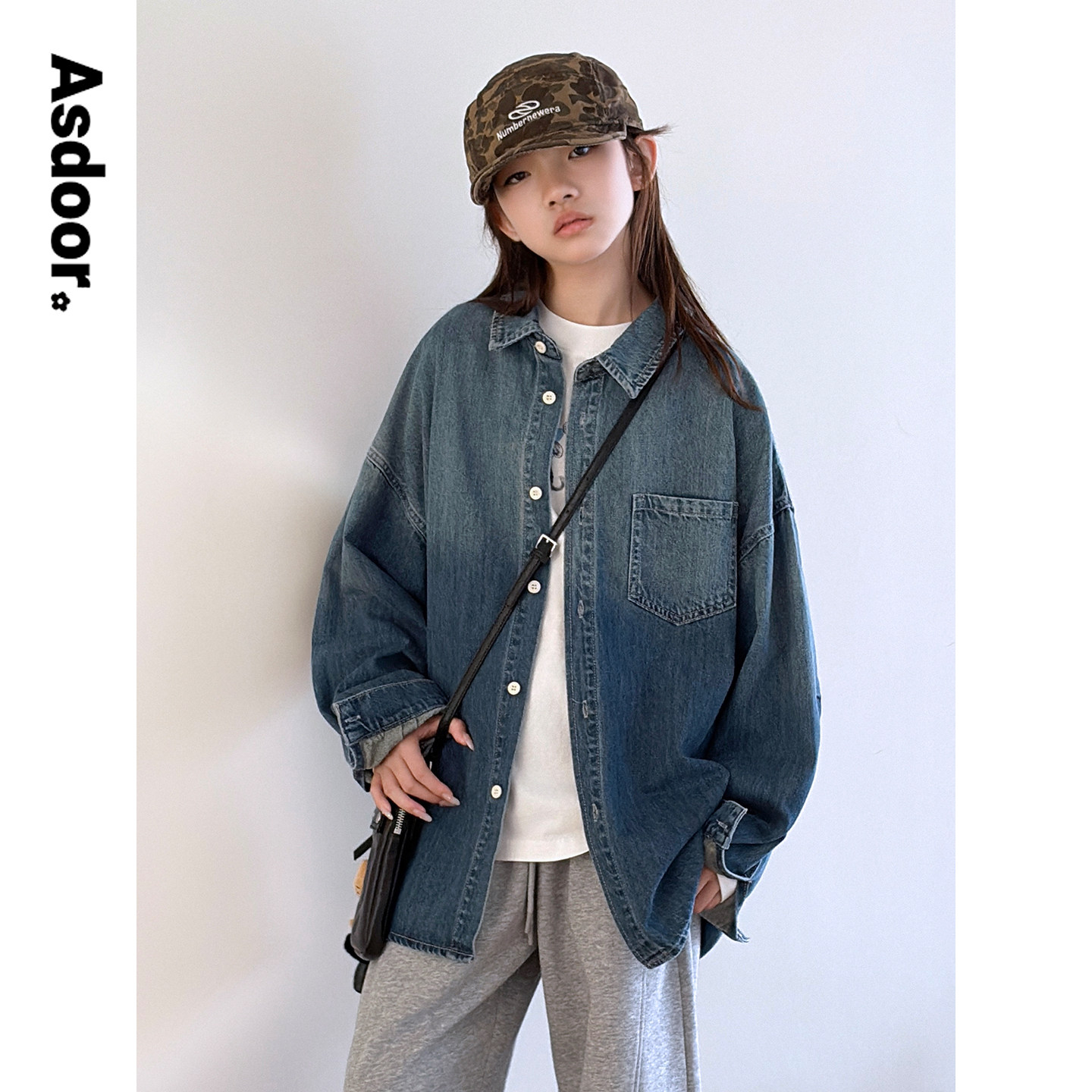 艾上朵女童牛仔衬衫2025秋装新款青少年洋气翻领外套学生休闲衬衣