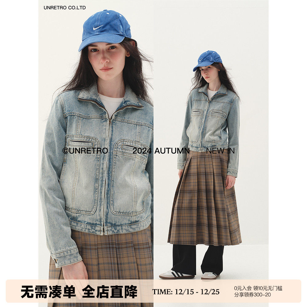 UNRETRO 甜酷做旧牛仔外套女春秋季复古学生小个子浅蓝色开衫上衣