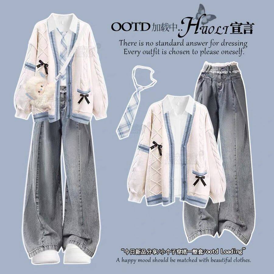 法国女童秋装2026新款套装洋气时髦毛衣12初中学生衬衫外套牛仔裤