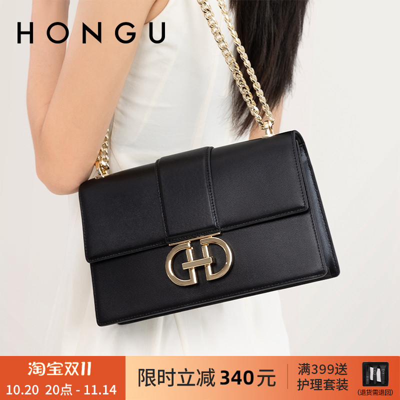HONGU红谷女包包牛皮单肩斜挎链条小方包时尚百搭休闲腋下包包