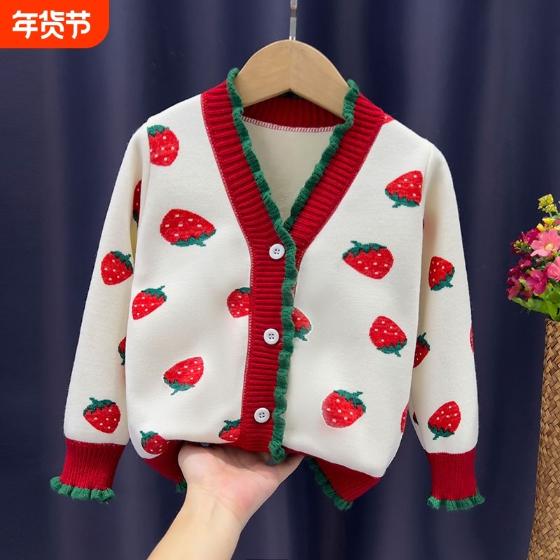 女童毛衣针织衫开衫一体绒加绒保暖外套秋冬长款2023新款潮草莓
