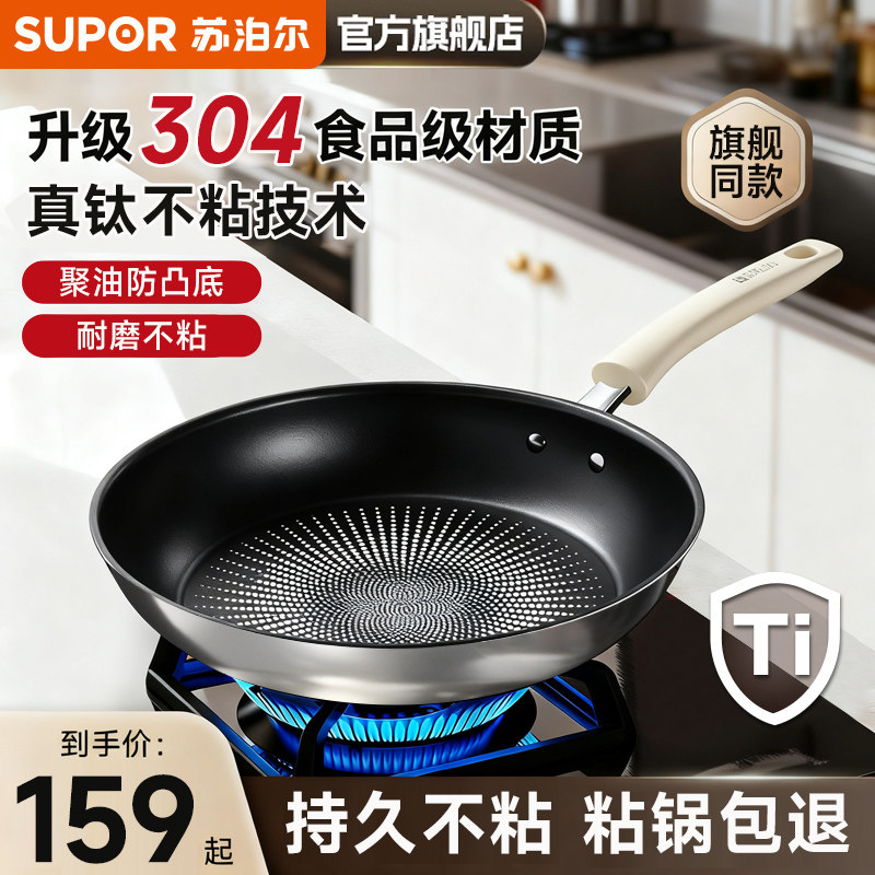 苏泊尔平底锅有钛家用不锈钢煎牛排鸡蛋不粘锅早餐煎饼锅电磁燃气