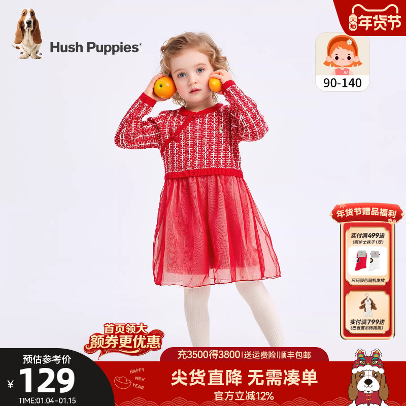 暇步士童装女童连衣裙冬新款小童新中式新年红裙子儿童网纱长袖裙