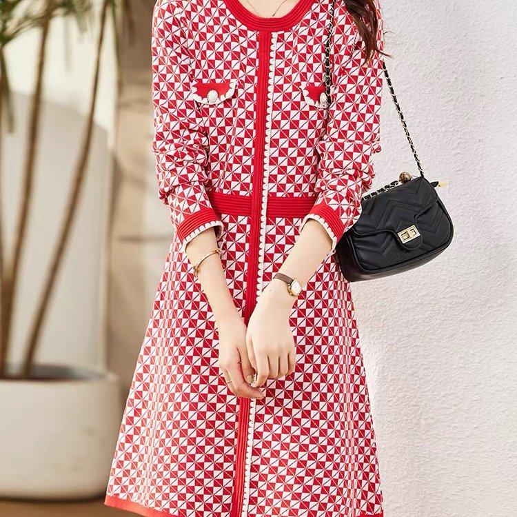 新年红裙子小香风针织连衣裙女2026年洋气春装收腰显瘦A字裙