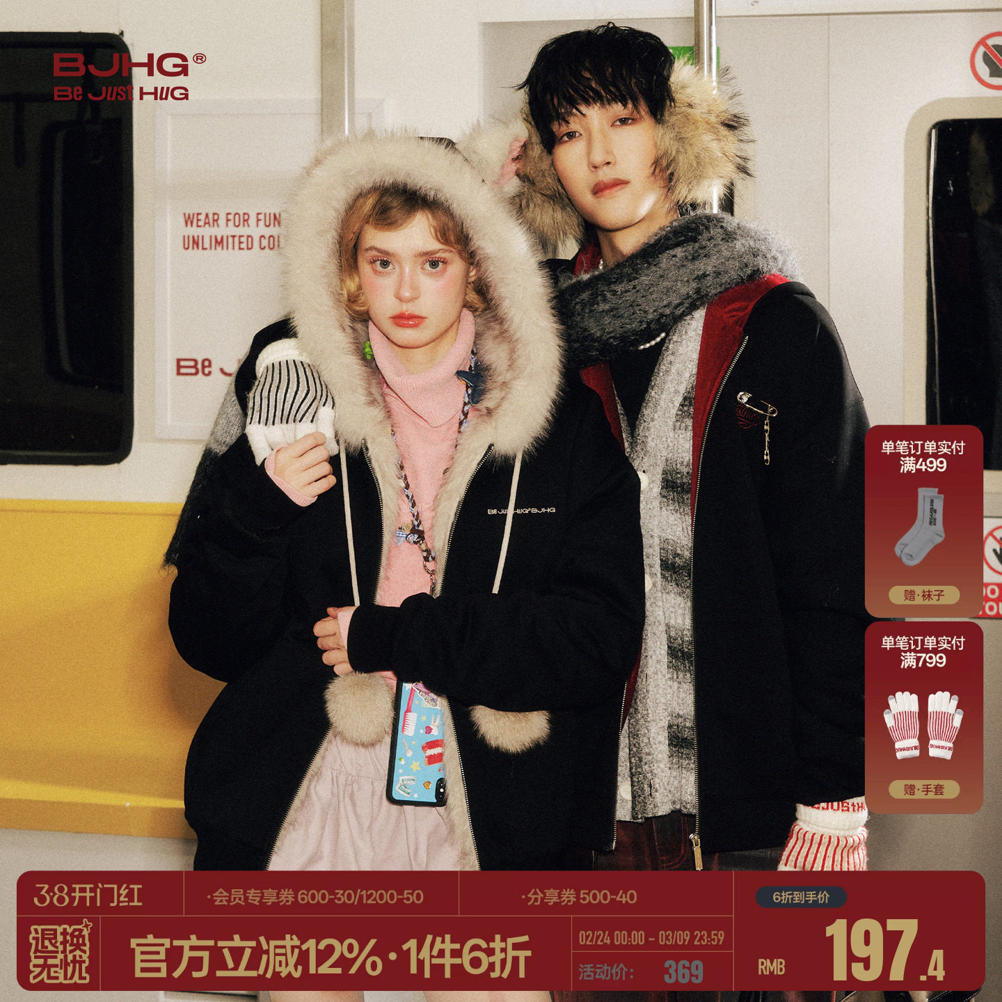 BJHG不计后果猫耳朵加绒连帽卫衣外套男女款冬季棉服休闲情侣夹克