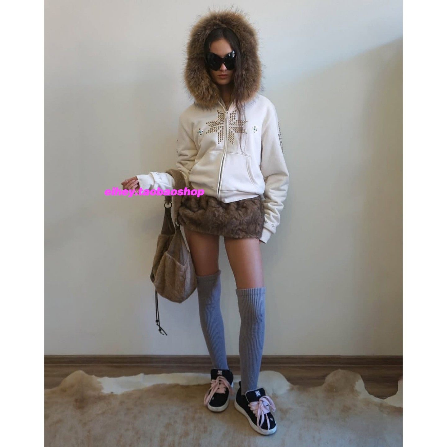 eihey诶嘿美式复古烫钻毛领加绒连帽卫衣外套女冬季宽松棉服外套