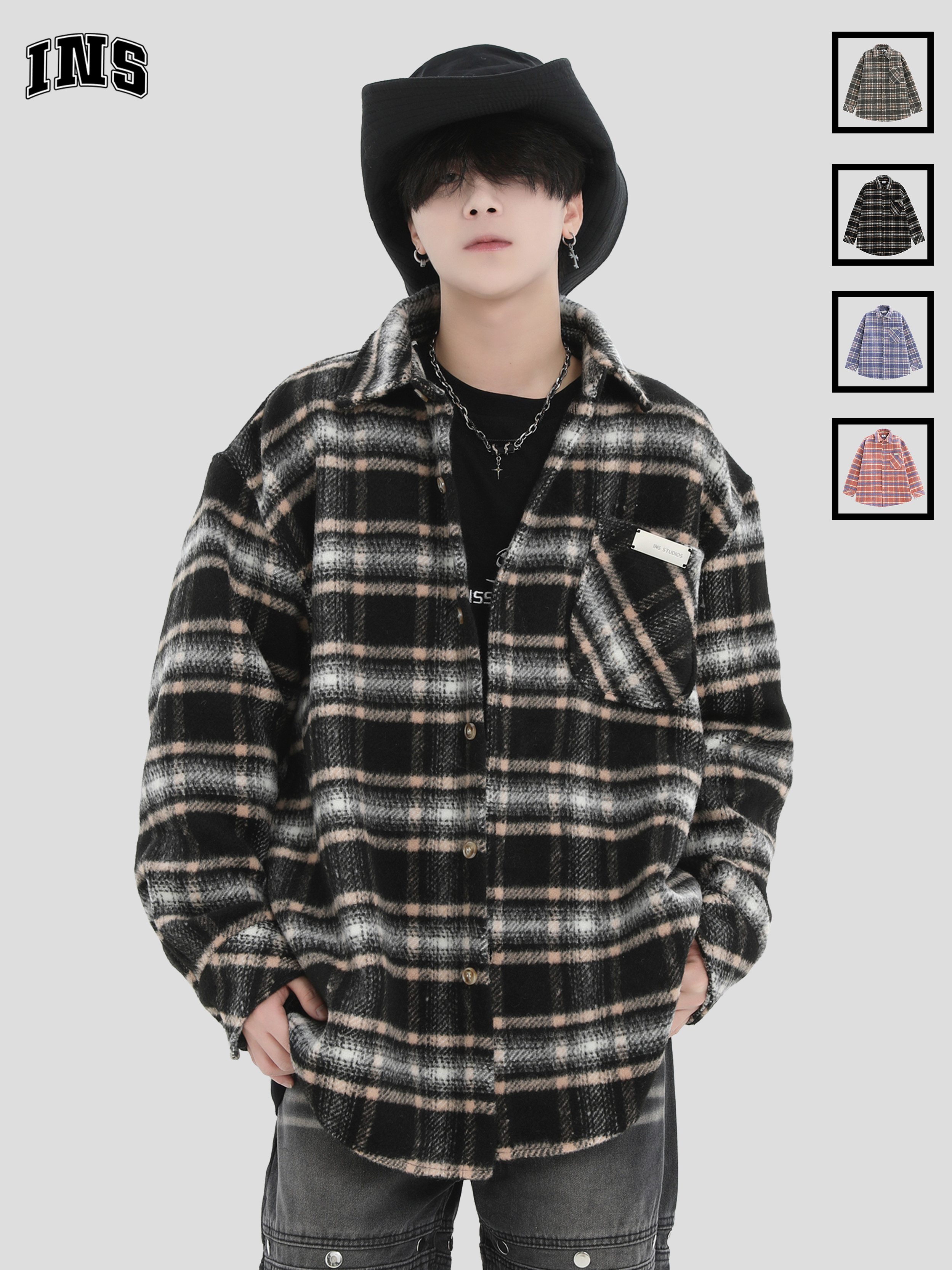 INSstudios 国潮牌情侣美式金属标LOGO格子毛呢外套宽松春装夹克
