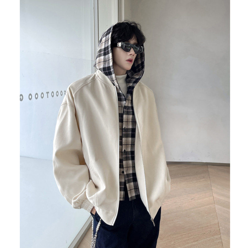 2026春装美式美式假两件格子连帽夹克男情侣宽松时尚cleanfit外套