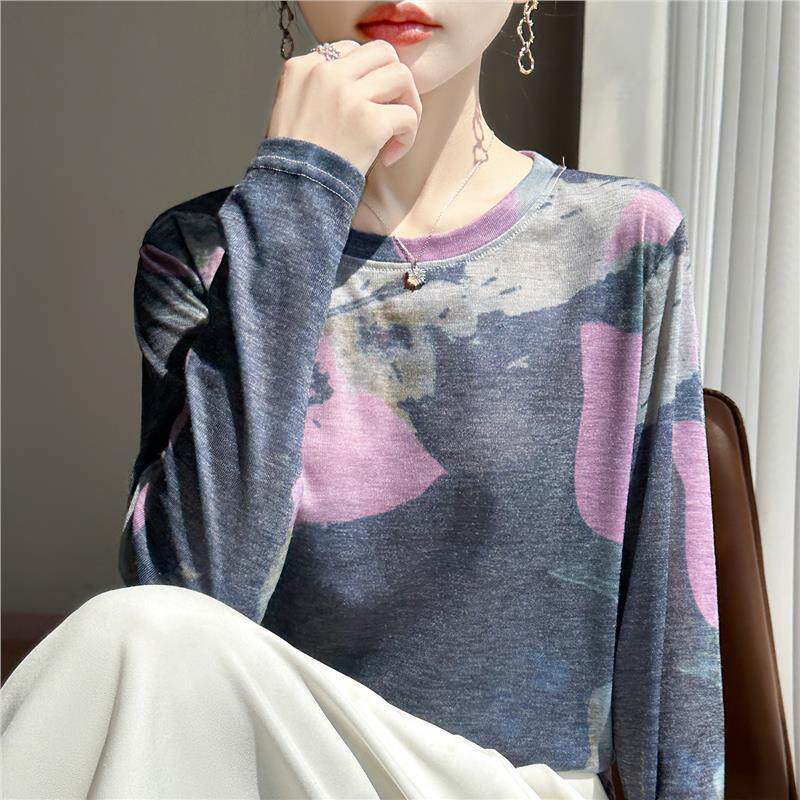 高级感时尚绝美晕染印花圆领套头毛衣女宽松大码长袖针织T恤上衣