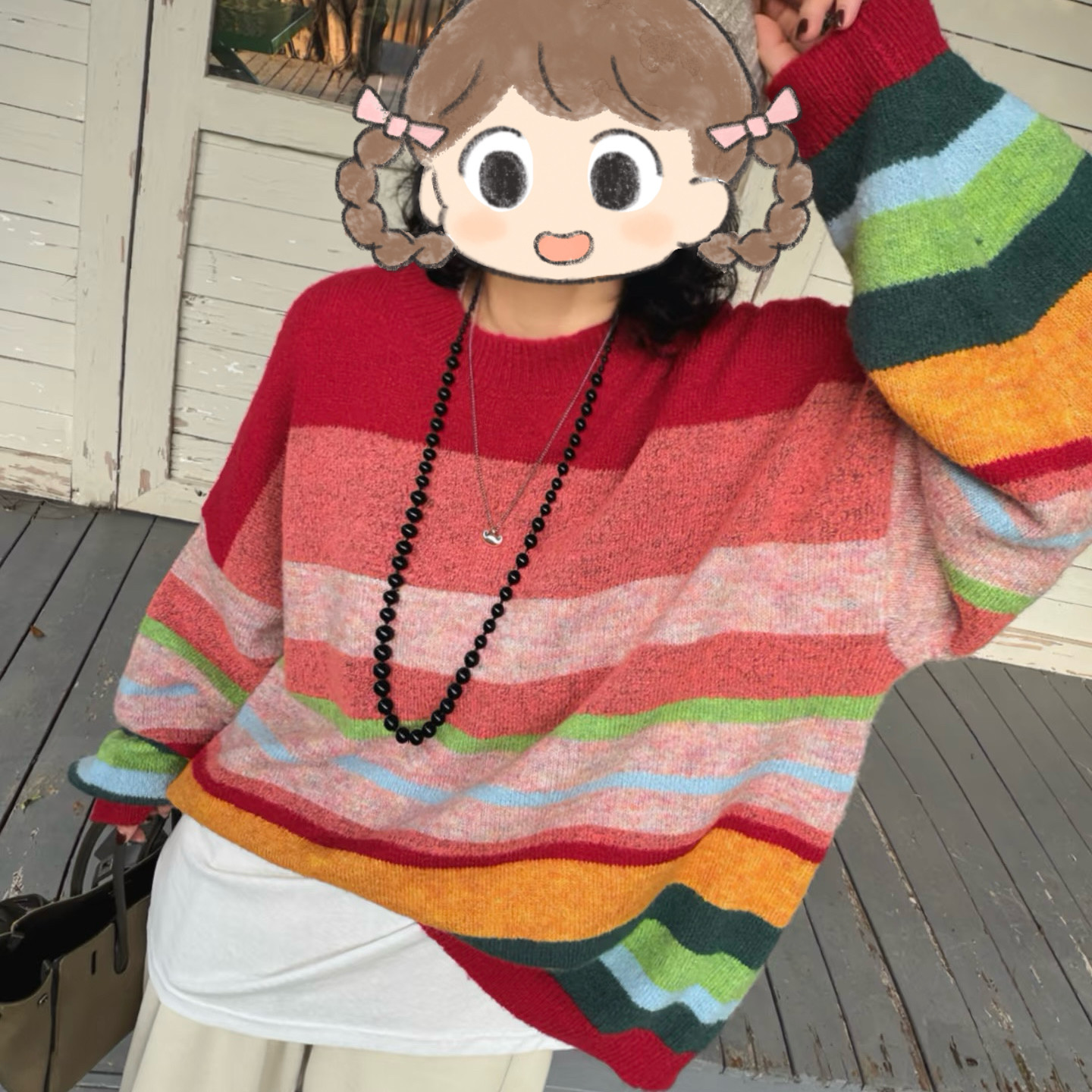秋冬韩版软糯彩虹条纹圆领套头毛衣女宽松慵懒风针织衫上衣多巴胺