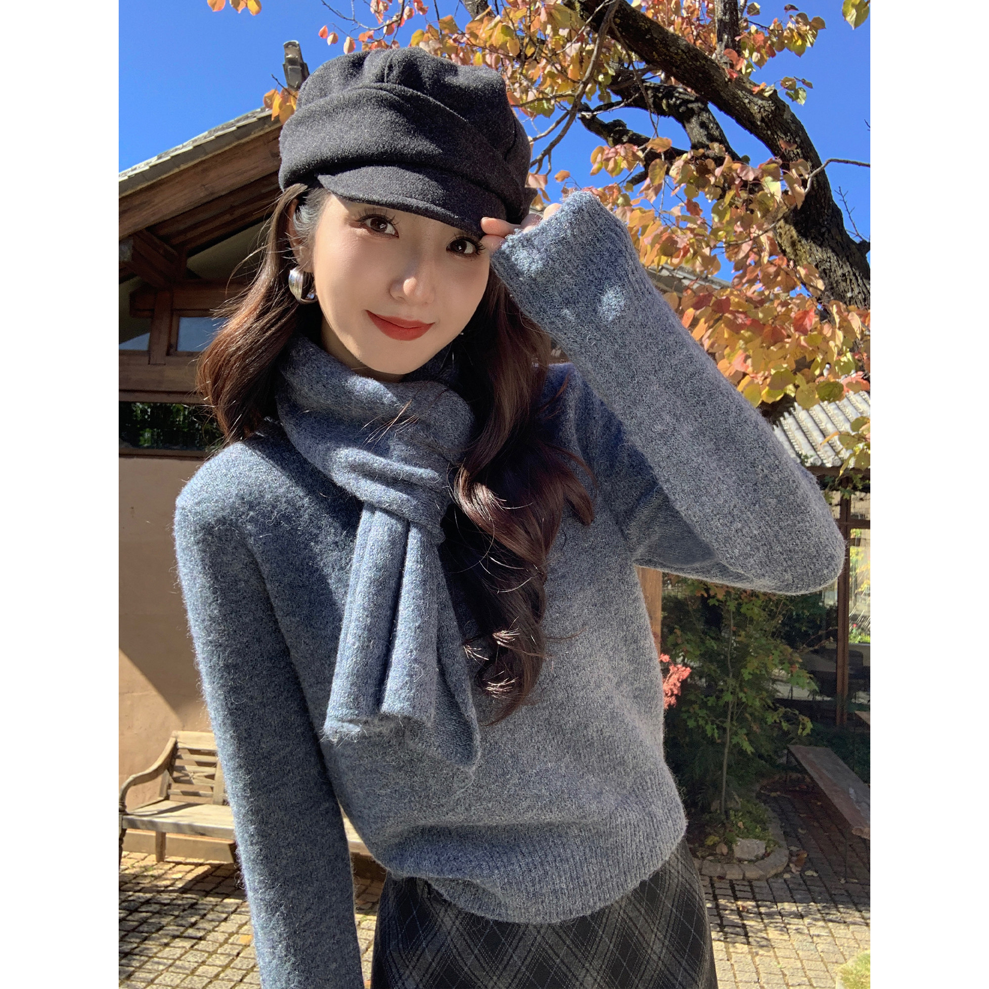 MULVAN 自带围巾~ 氛围感圆领套头毛衣女宽松休闲长袖针织衫上衣