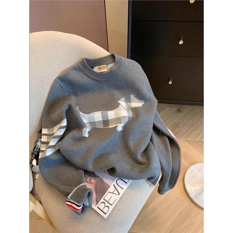 灰色小狗格纹圆领套头毛衣女宽松秋冬新款休闲百搭气质软糯针织衫