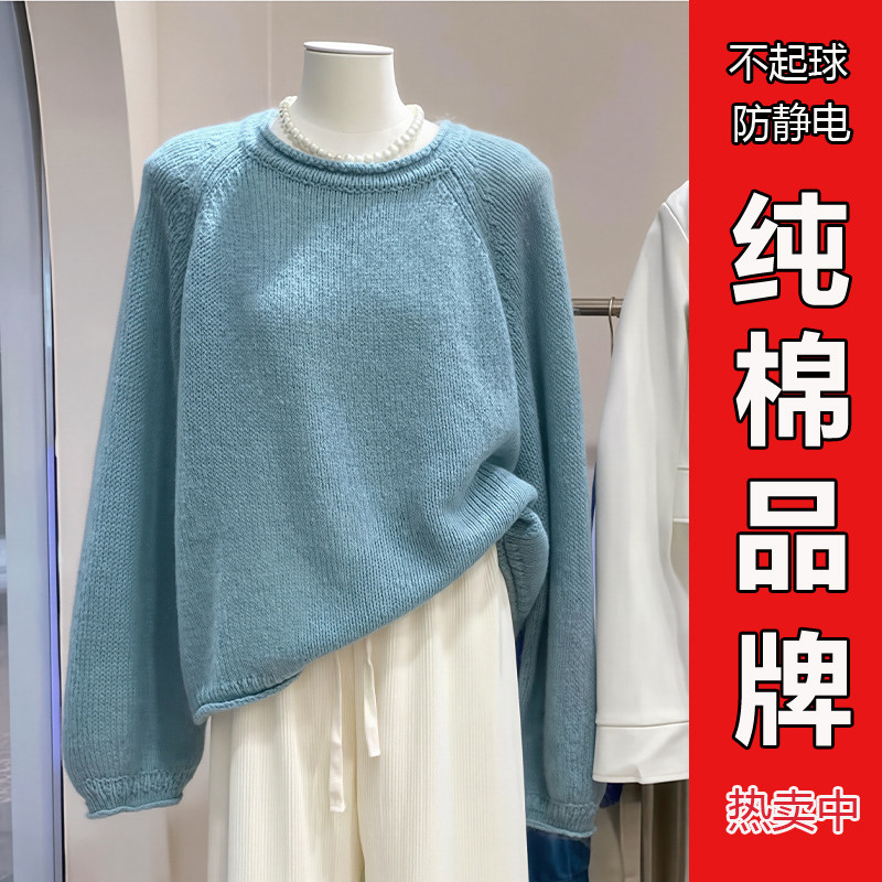 100%纯棉慵懒风圆领套头毛衣女宽松显瘦针织打底衫温柔风蓝色上衣