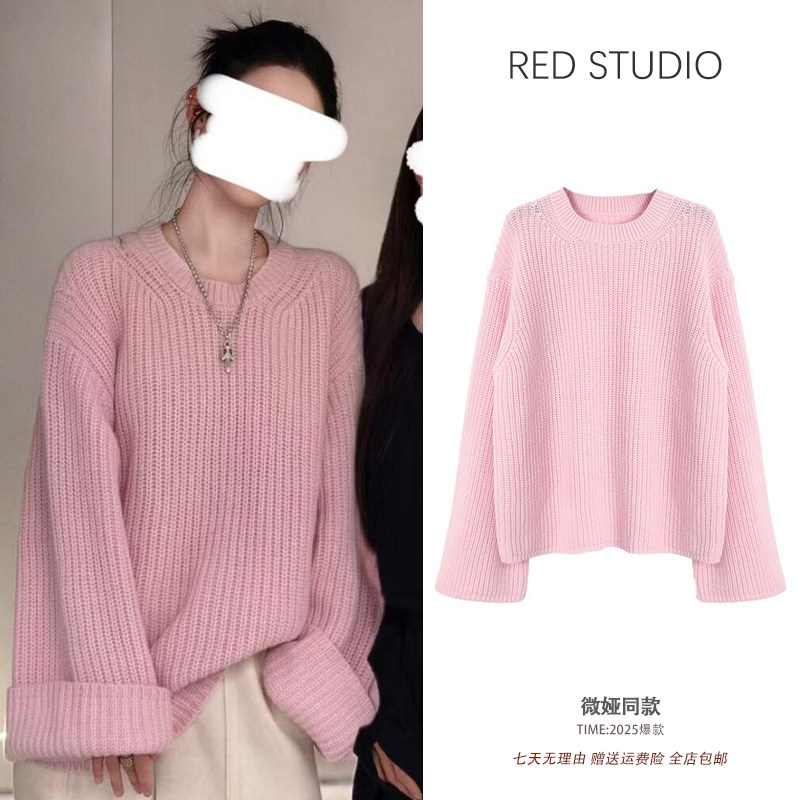 微娅同款樱花粉色长袖套头毛衣女宽松慵懒温柔软糯减龄针织衫上衣