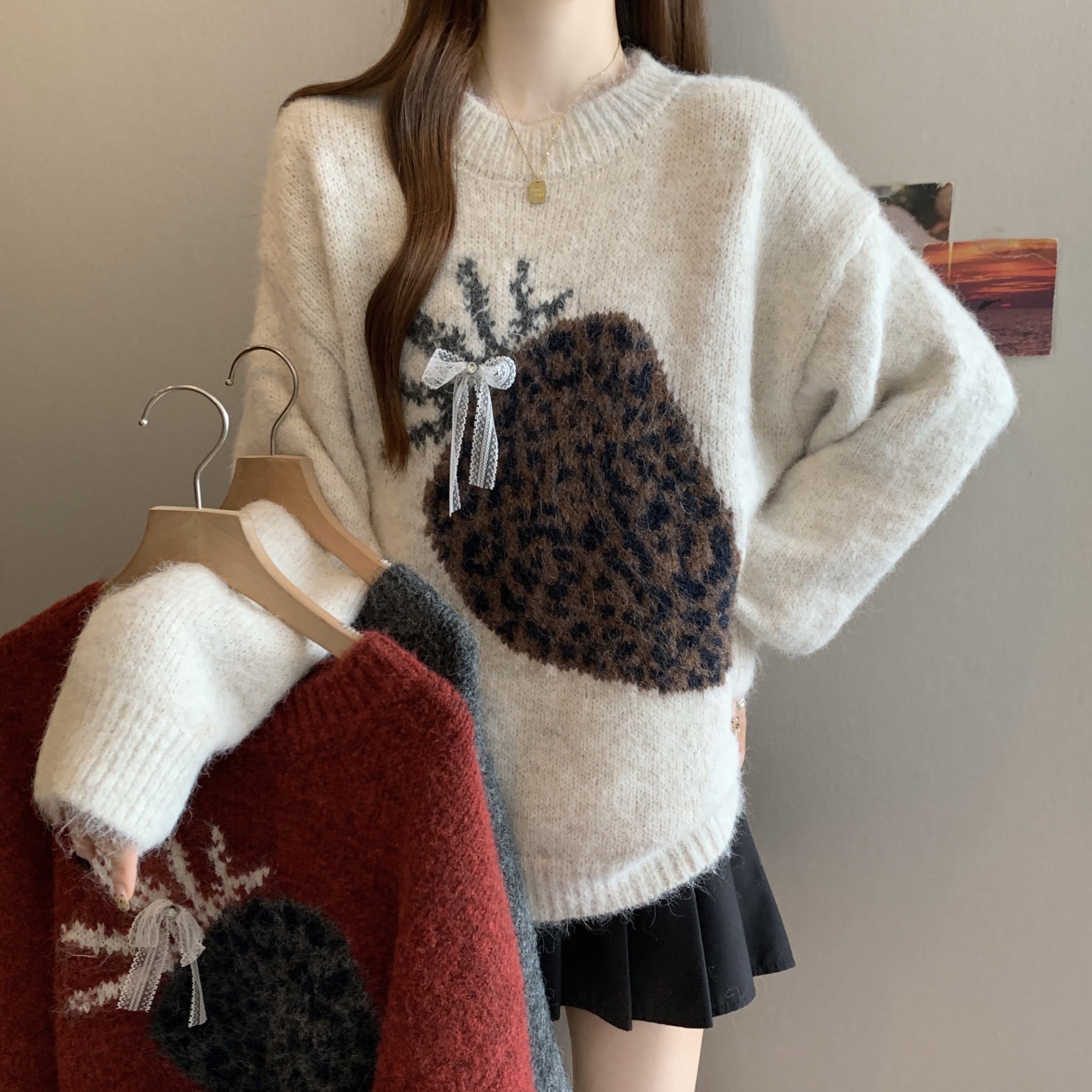 秋冬新款复古豹纹草莓套头毛衣女宽松显瘦蝴蝶结慵懒风针织衫上衣