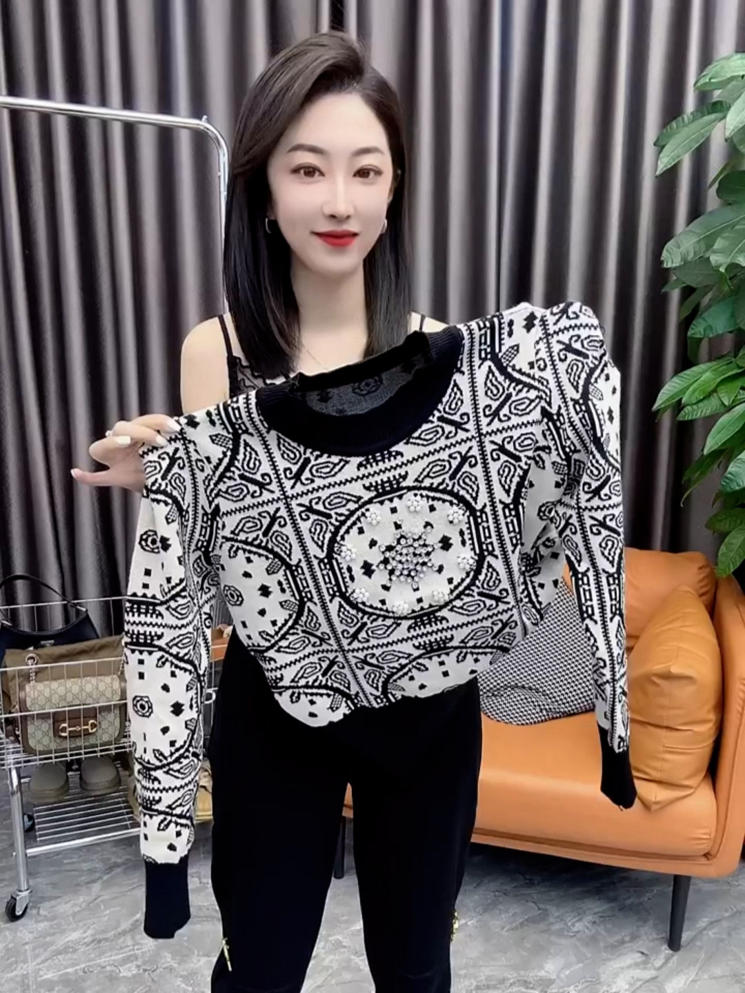 欧货2025秋冬新款镶钻拼色复古提花套头毛衣女宽松长袖针织衫上衣
