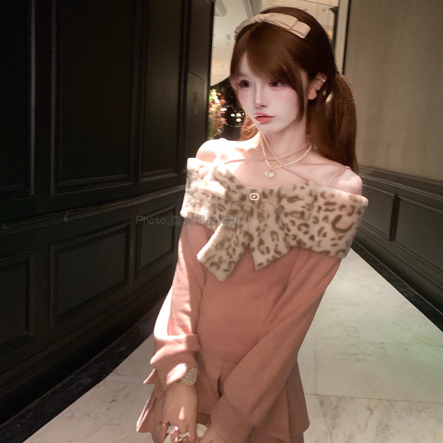 森女系原创想去海边 织云小豹 豹纹蝴蝶结一字肩修身连衣裙针织