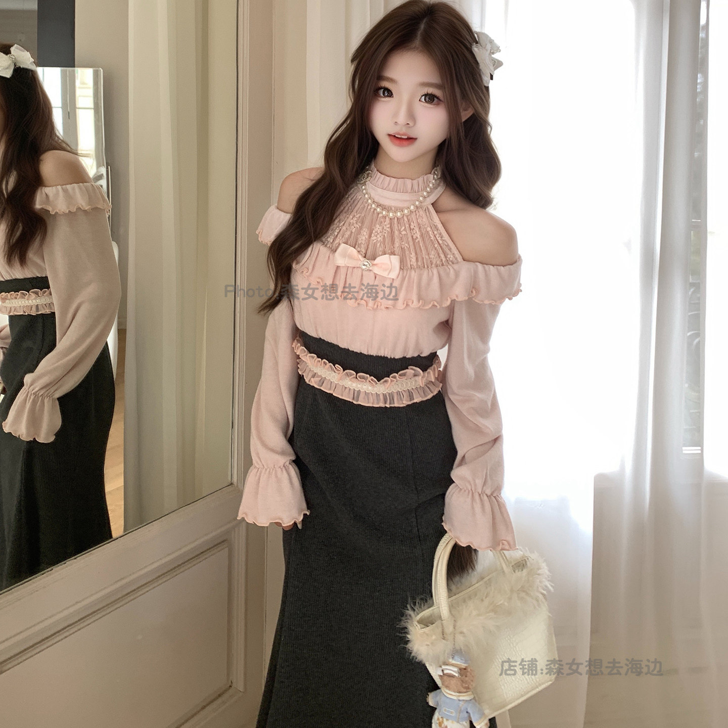 森女系原创想去海边 香水百合 温柔清楚系粉粉荷叶边露肩连衣裙