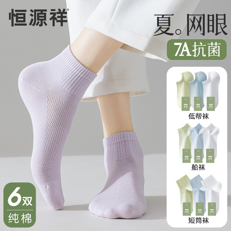 恒源祥纯棉无骨袜子女夏季薄款吸汗防臭网眼袜透气抗菌船袜短筒袜