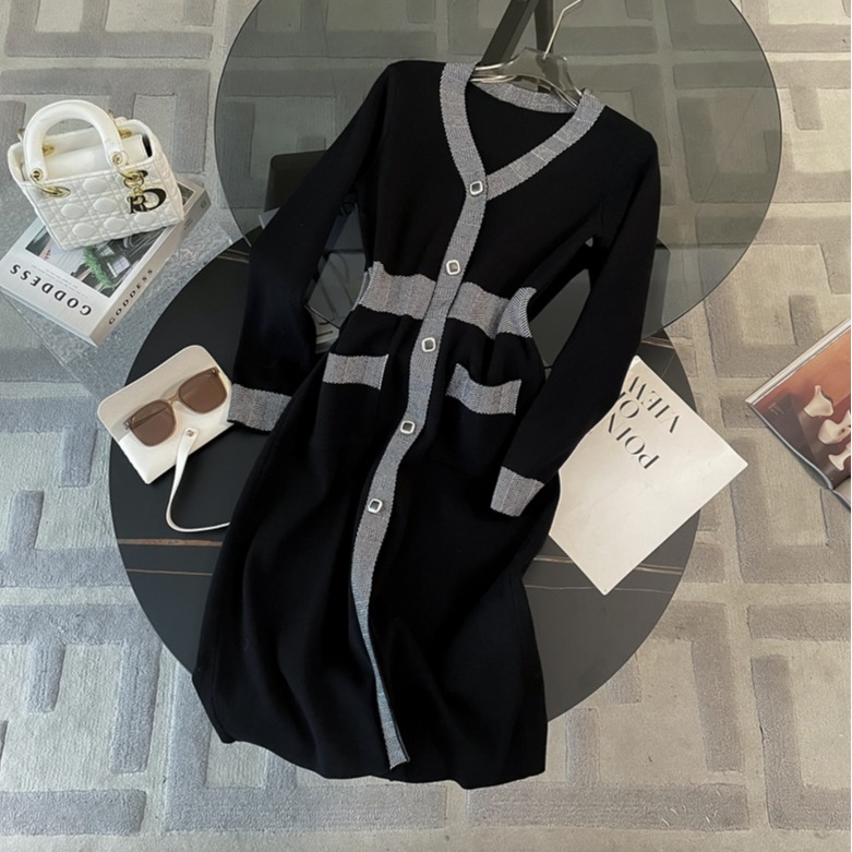 韩国V领撞色条纹针织衫毛衣连衣裙女秋冬高级感轻奢OL内搭打底裙