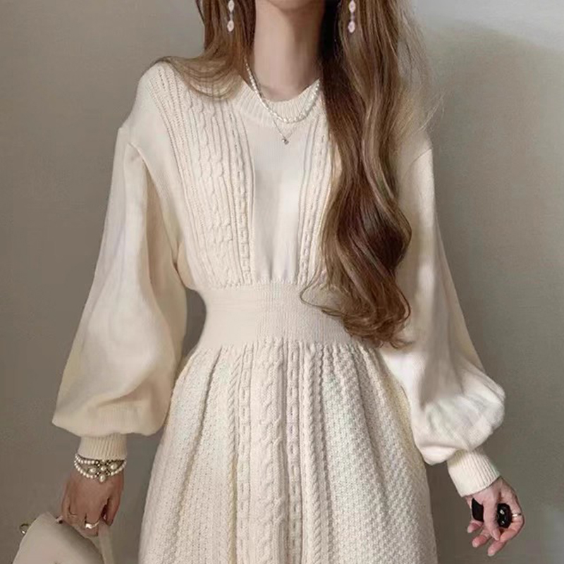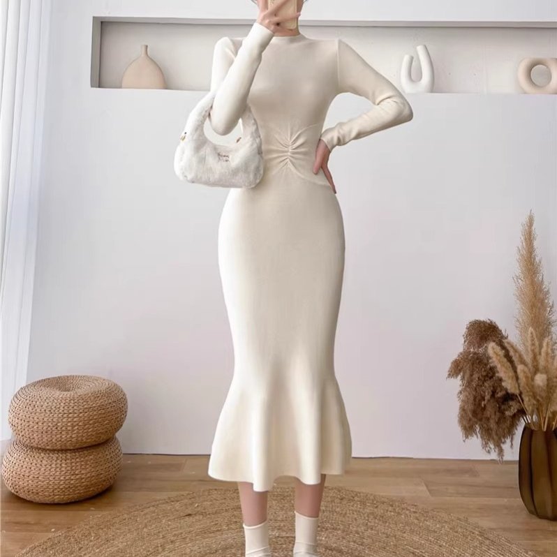 韩国鱼尾针织毛衣连衣裙女秋冬收腰抽褶OL内搭打底配大衣过膝长裙