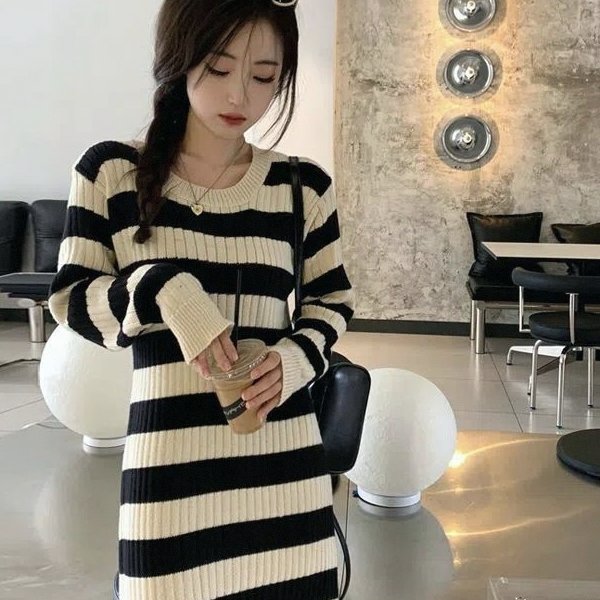 韩国条纹撞色针织毛衣连衣裙女秋冬慵懒风配大衣内搭打底过膝长裙