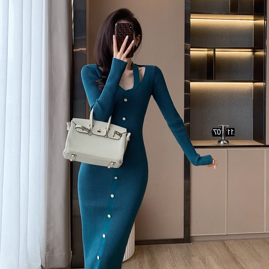 韩国v领挂脖OL针织毛衣连衣裙女秋冬夜店心机中长款过膝打底长裙