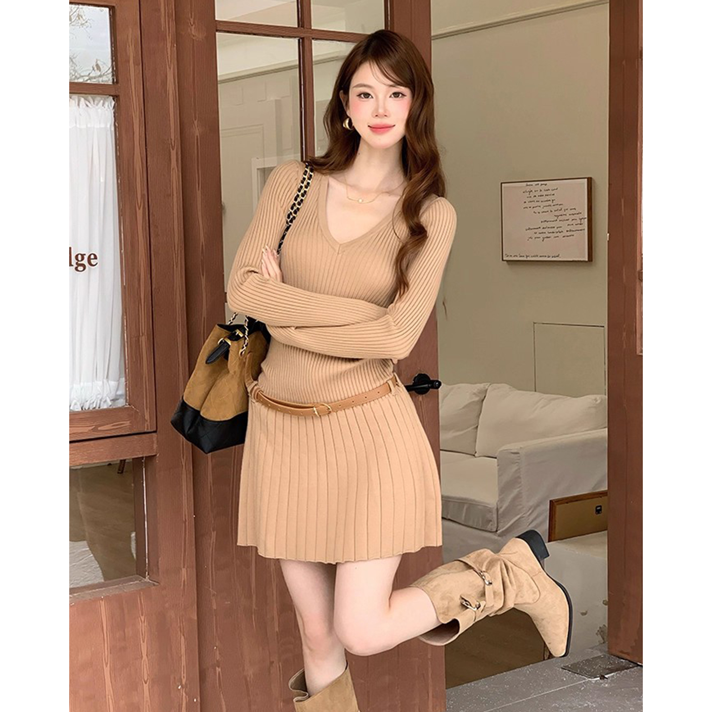 韩国气质御姐风V领毛衣针织连衣裙女秋冬小个子高腰显瘦OL打底裙