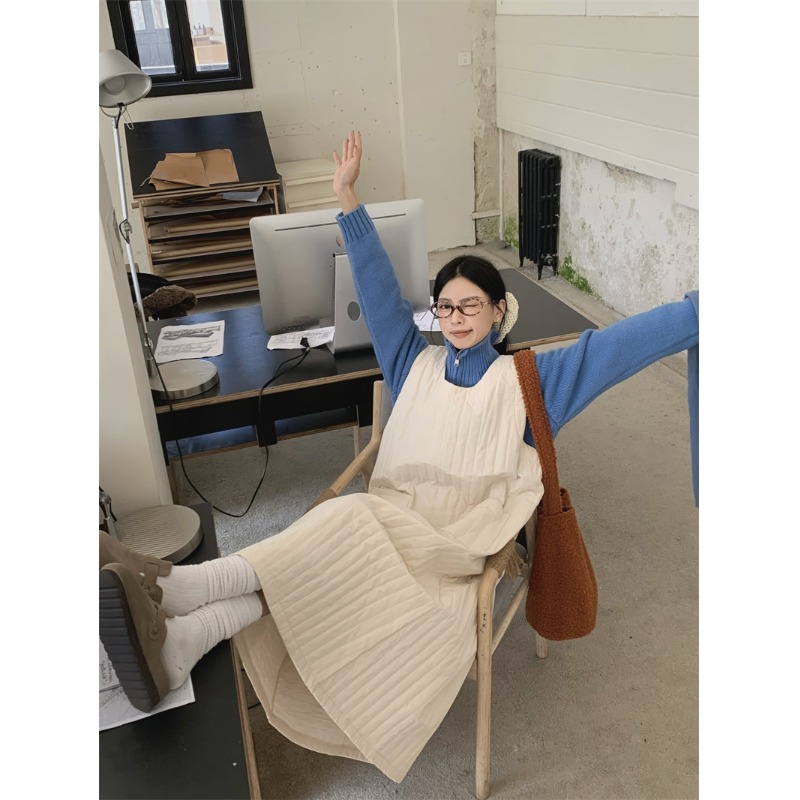 PPSHD 秋冬夹棉背心连衣裙加厚保暖叠穿背心裙+立领蓝毛衣套装