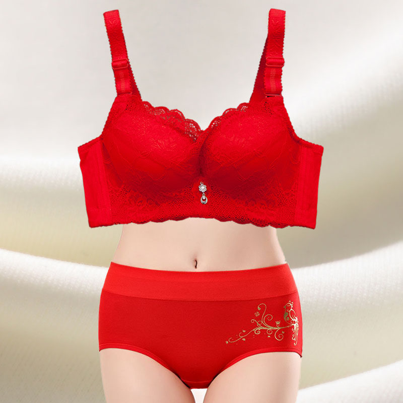 大红色文胸套装本命年女无钢圈聚拢结婚内衣女新娘厚薄大码大胸罩