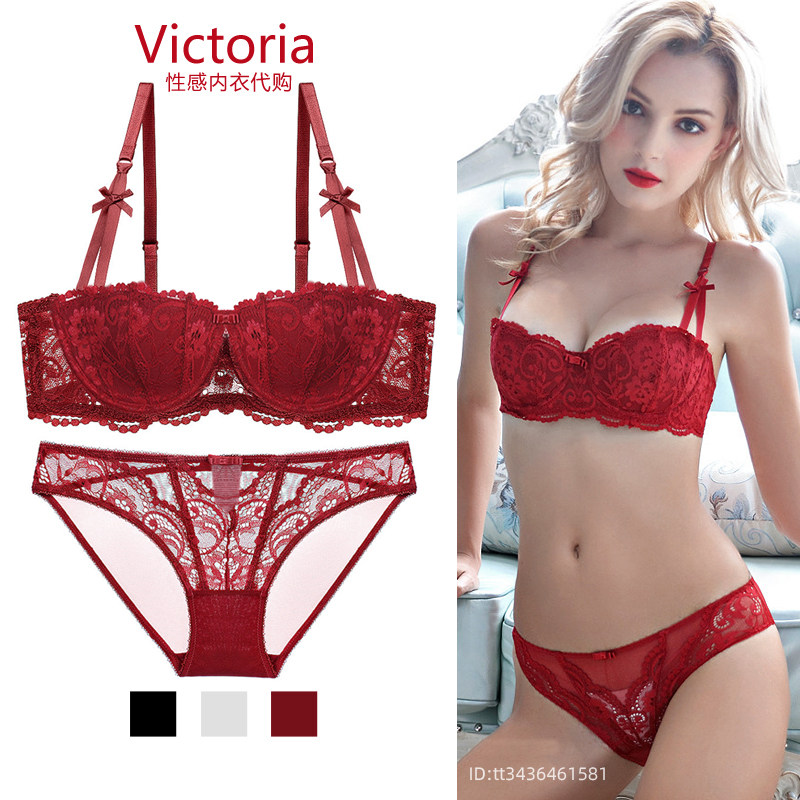 正品维多性感利亚本命年红色文胸套装蕾丝小胸聚拢薄款内衣女半杯