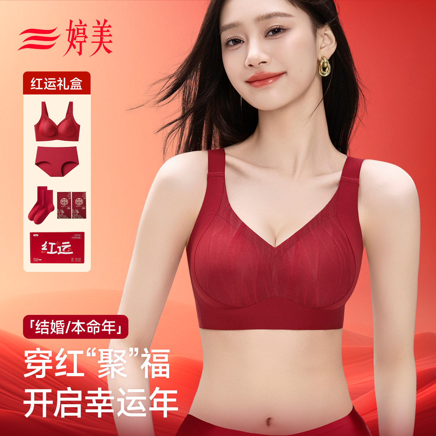 婷美本命年红色文胸套装女小胸聚拢提拉结婚新娘性感内衣内裤礼盒