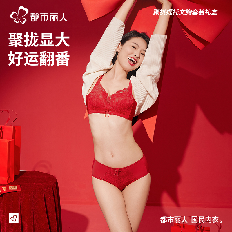 都市丽人大红色文胸套装无痕中国红本命年结婚喜庆送礼高端礼盒装