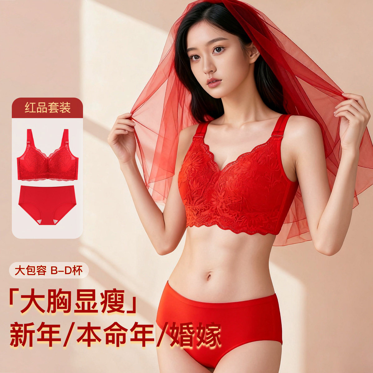 本命年结婚内衣新娘大红色文胸套装性感蕾丝大胸显小超薄胸罩大码
