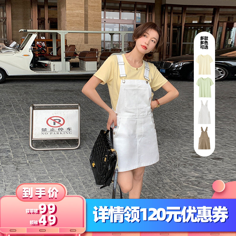 大码女装胖mm减龄显瘦套装韩版宽松T恤+法式茶歇小清新牛仔背带裙