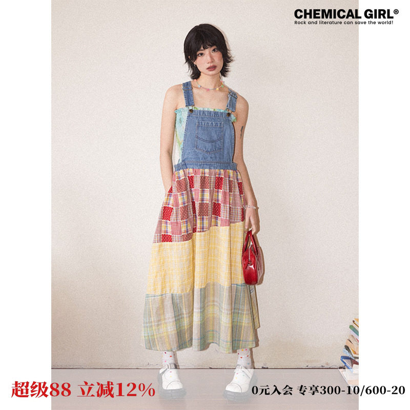 化学少女「精灵画家」牛仔拼接背带连衣裙松紧腰A字廓形长款裙子