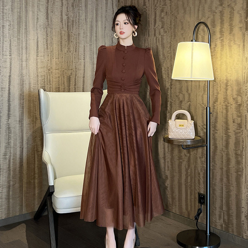 2025新款大方得体绝美冬裙长裙法式复古拼接网纱收腰连衣裙女装潮