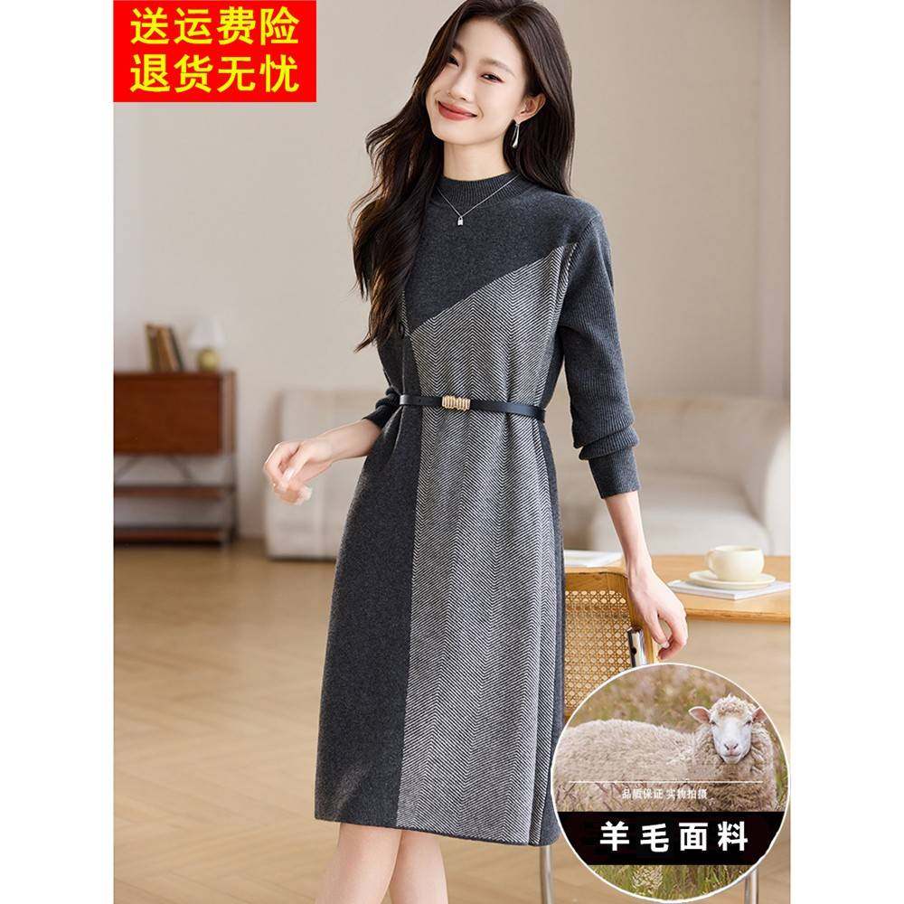 毛衣裙女秋冬2025年新款高级感羊毛针织连衣裙加厚拼色配大衣冬裙