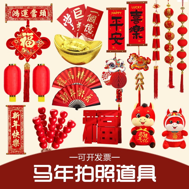 新马年拍照拍摄道具装饰品挂件春节氛围摆件儿童表演灯笼对联扇子