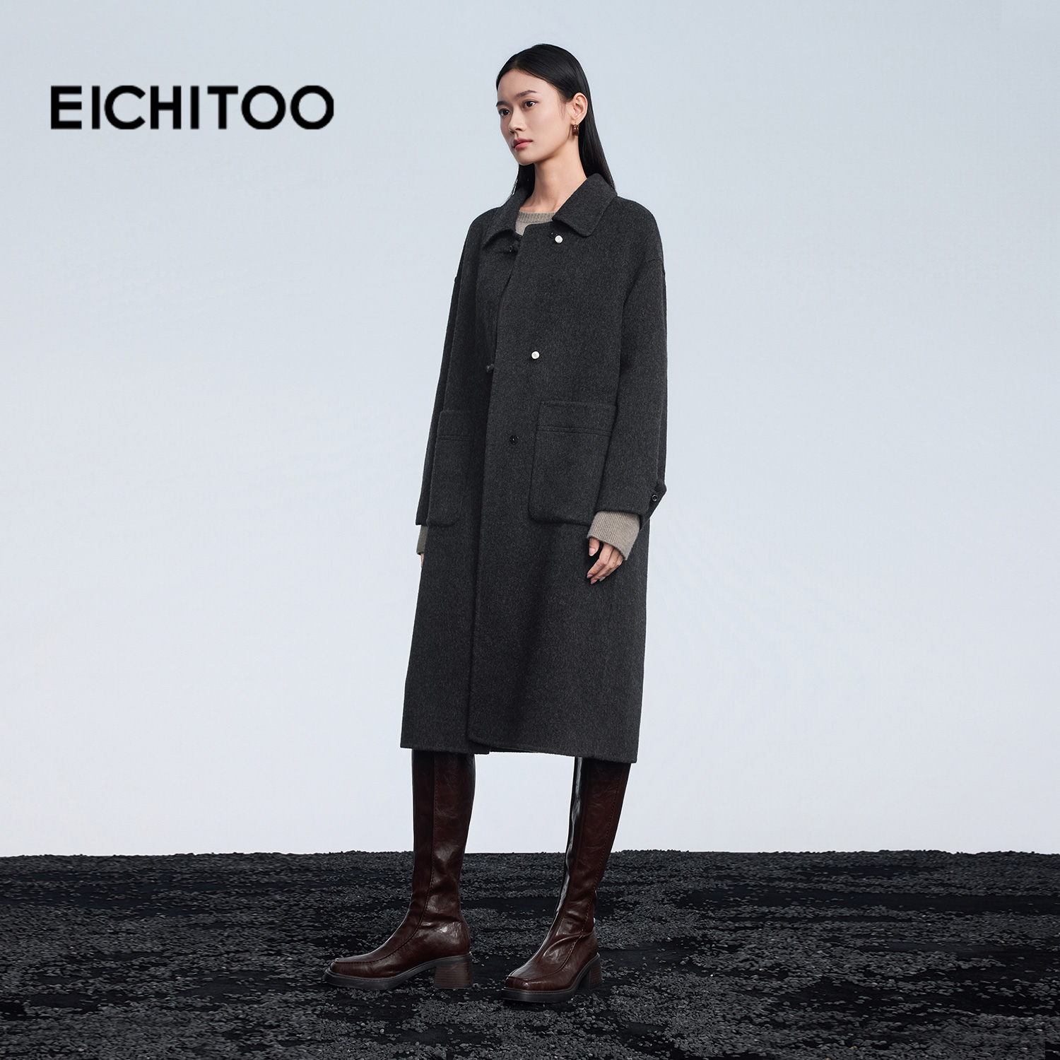SIXI四喜家 英黎俱乐部 经典正肩灰色毛呢大衣女秋冬廓形长款外套
