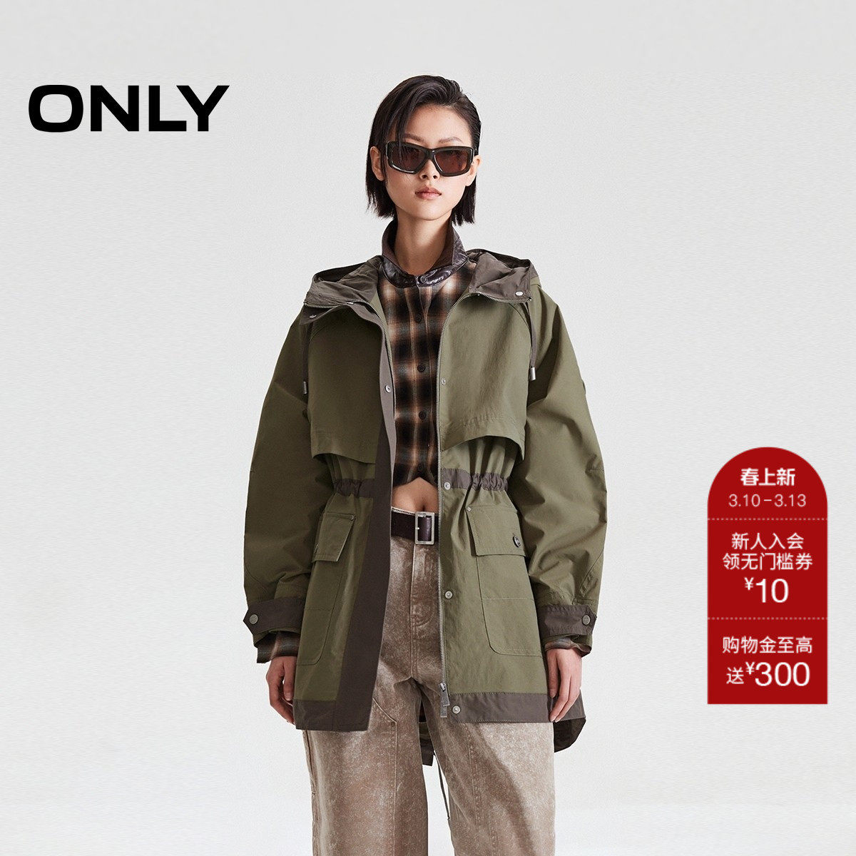 【ONLY奥莱】春季新款双开拉链收腰工装风连帽宽松中长款外套女