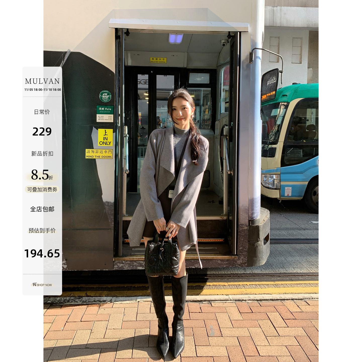 黄亮Elovey 黑灰色加厚羊毛大衣中长款外套冬季手工缝制收腰01-02