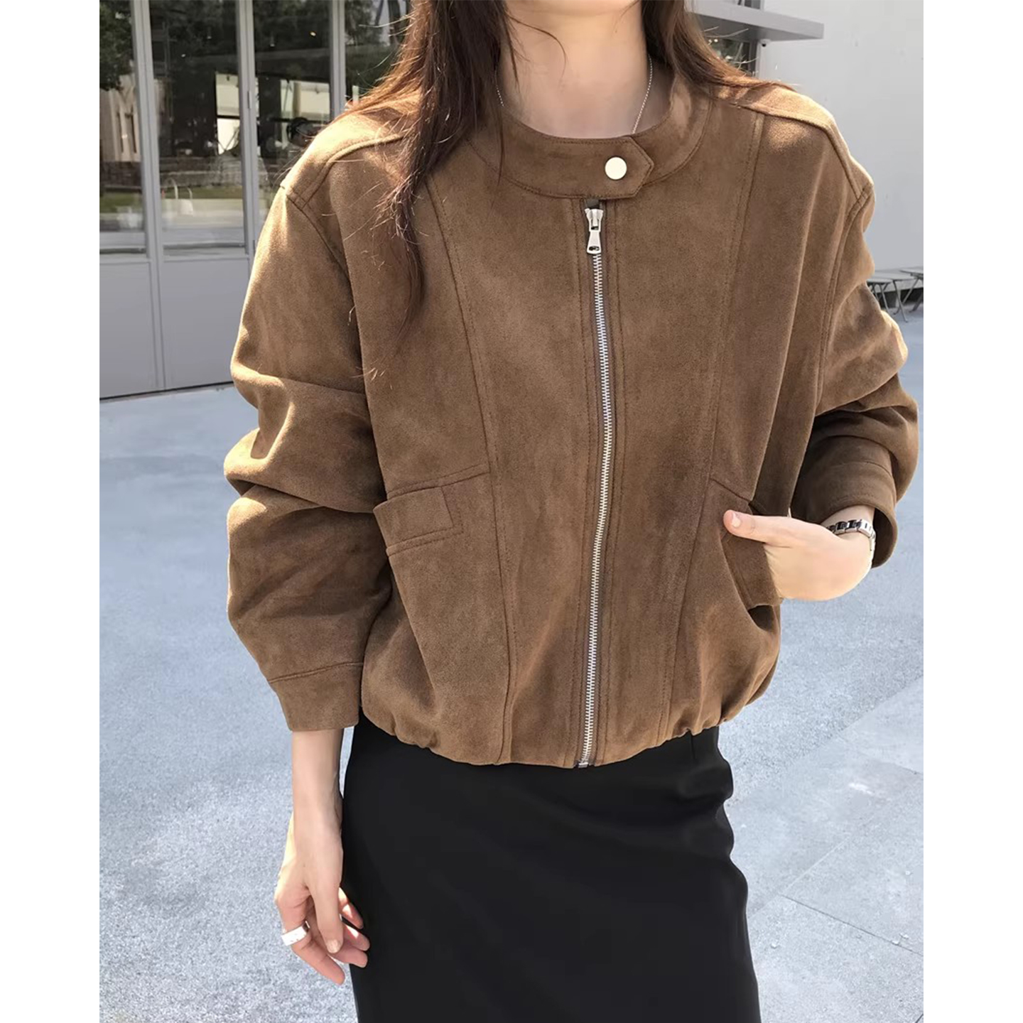 日韩系复古简约鹿皮绒磨毛外套女秋休闲洋气百搭短款飞行夹克上衣